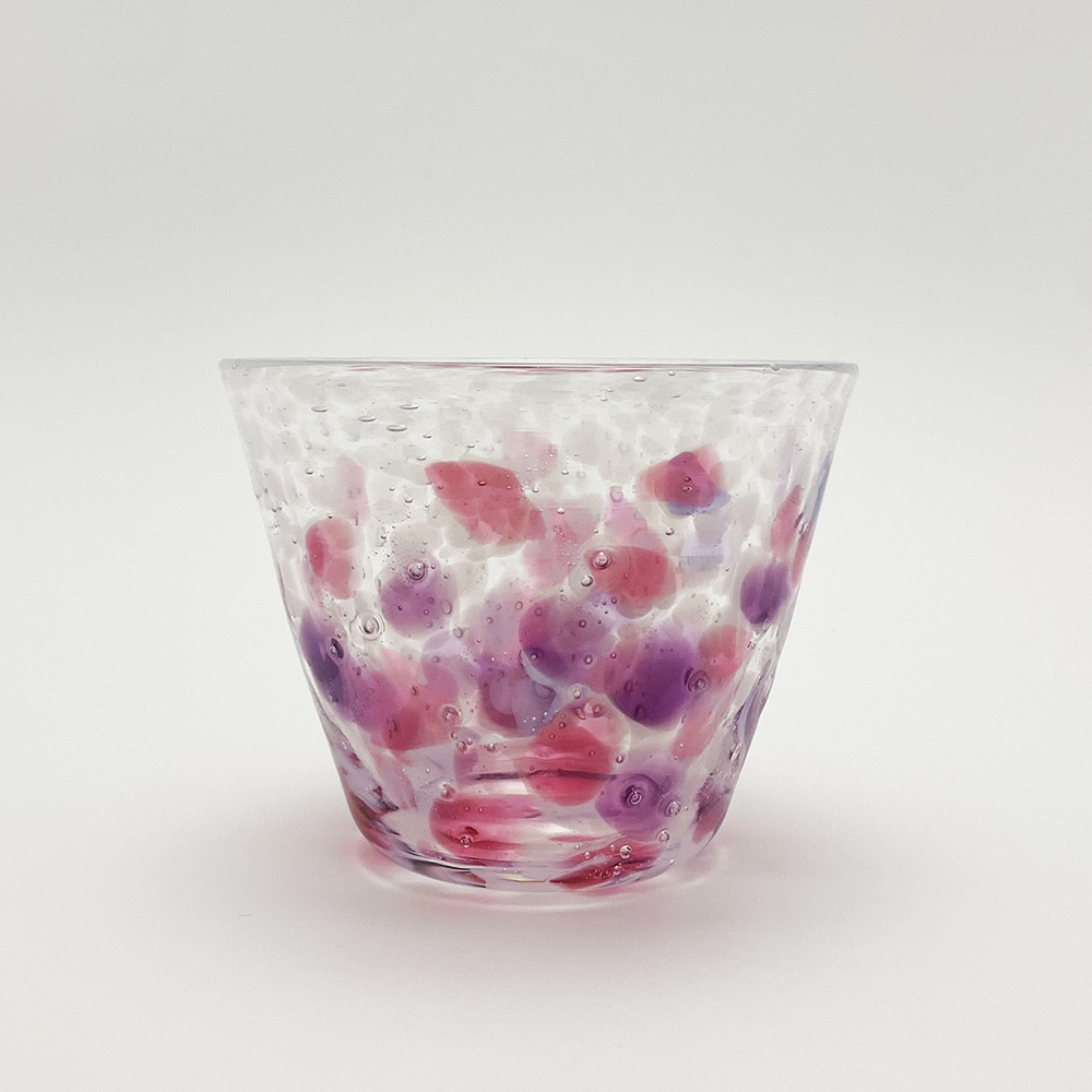 実りの秋の季節を連想させるグラスです。乳白色の細かい水玉模様の中に大柄のピンク色や紫色...