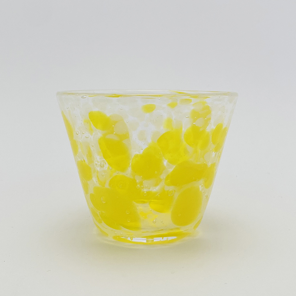 色鮮やかな春の季節を連想させるグラスです。乳白色の細かい水玉模様の中に大柄の黄色の水玉...