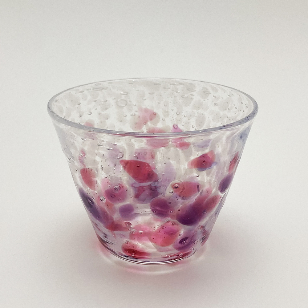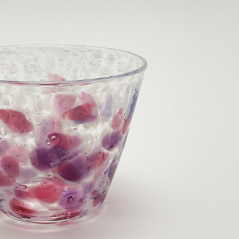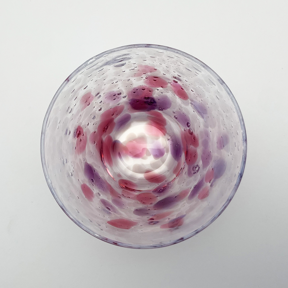 実りの秋の季節を連想させるグラスです。乳白色の細かい水玉模様の中に大柄のピンク色や紫色の水玉模様が散りばめられています。 グラスとしては勿論、デザートカップ等でもご使用いただけます。