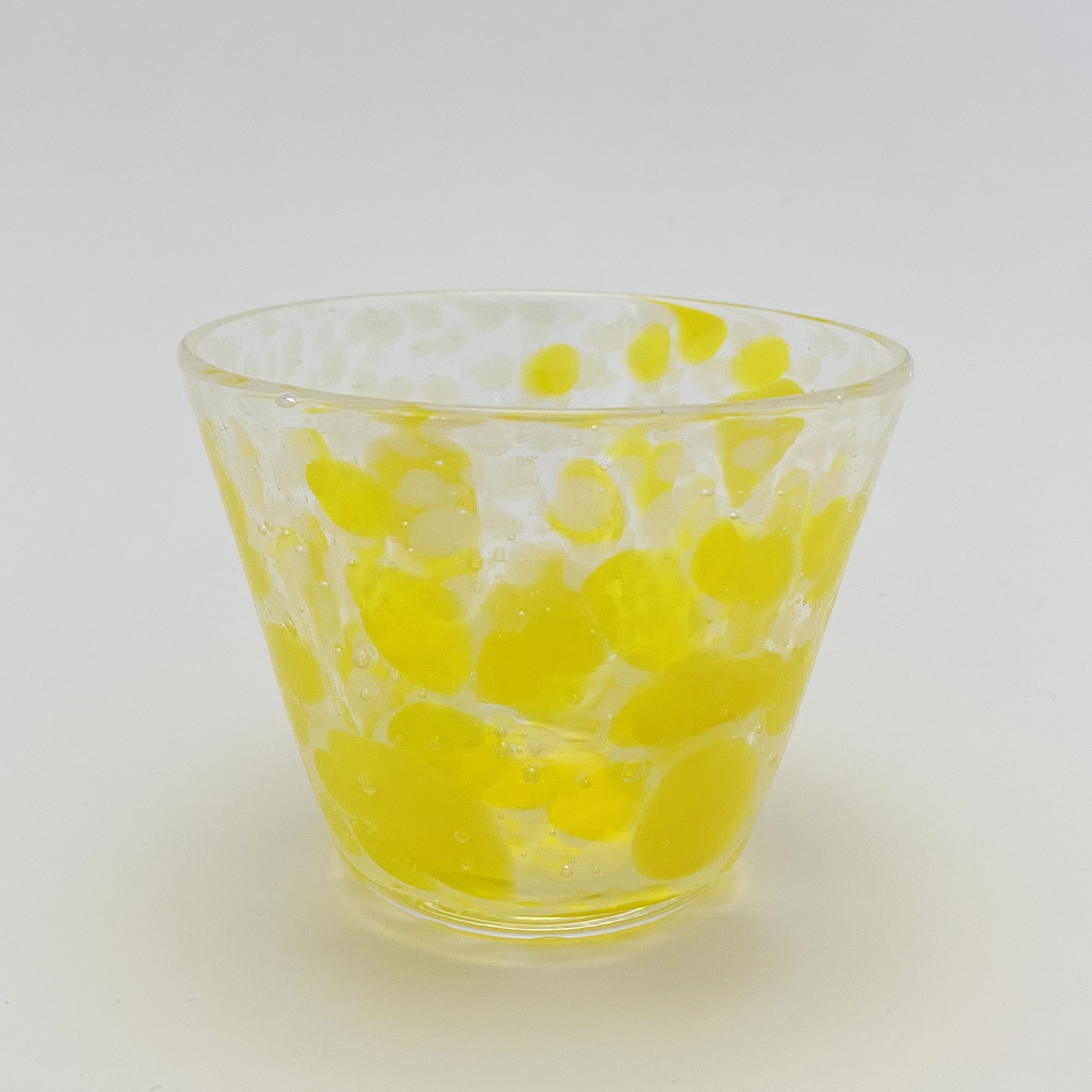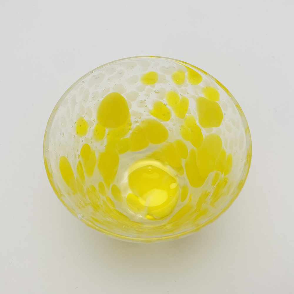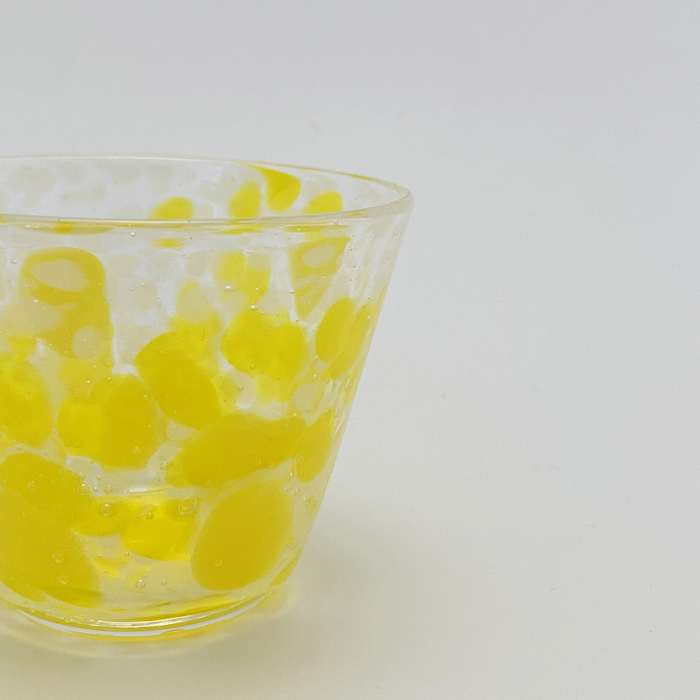 色鮮やかな春の季節を連想させるグラスです。乳白色の細かい水玉模様の中に大柄の黄色の水玉模様が散りばめられています。