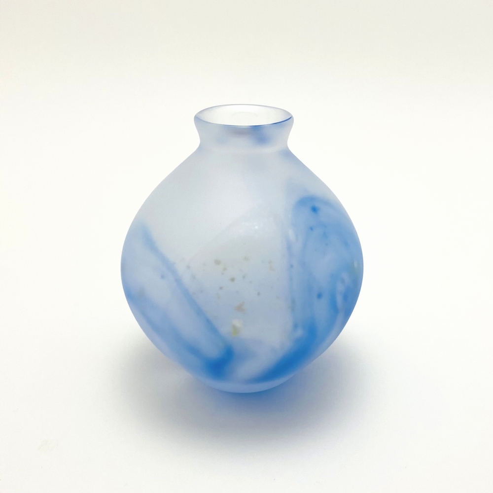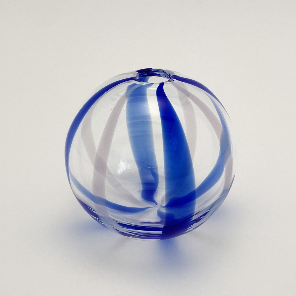 青色と乳白色の縞模様が入った花器です。コロンとした丸い形がポイントです。...