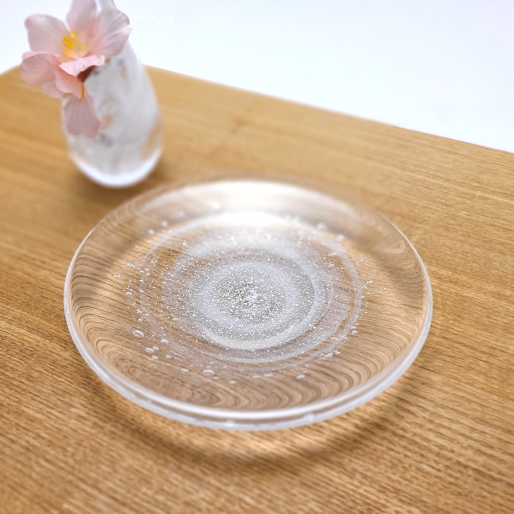 雨上がりの雨粒のきらめきをイメージしたグラスです。柔らかな色の中に銀澄のきらめく模様が...